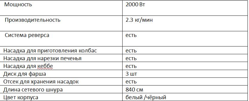 Производитель наделил прибор хорошей комплектацией. Помимо классического диска, предназначенного для обработки фарша, оборудование укомплектовано насадками для изготовления колбас и сосисок, измельчения печенья и современной насадкой для приготовления кеббе.